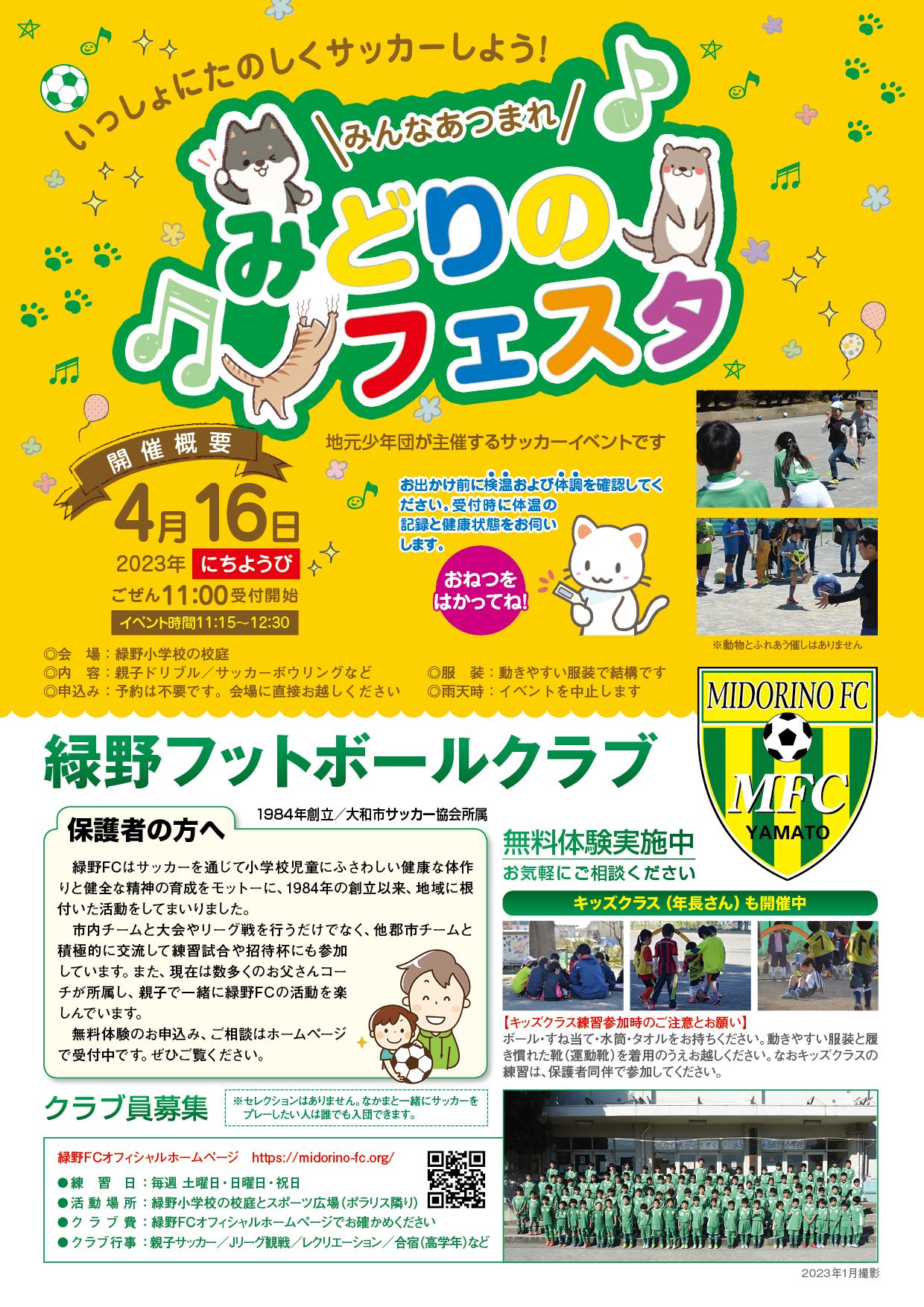 <団員随時募集中> 緑野フットボールクラブは、神奈川県大和市立緑野小学校を拠点に活動するサッカー少年団です。当団はサッカーを通じて小学校児童にふさわしい健康な体作りと健全な精神の育成をモットーに、